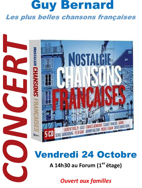 Concert Nostalgie, chansons françaises, avec Guy Bernard. Concert ouvert aux familles.