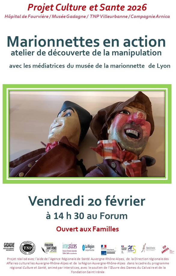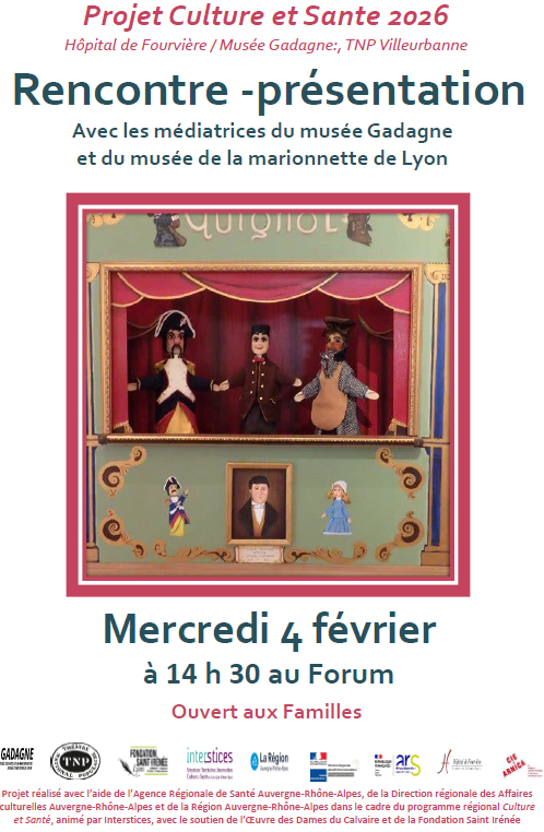Rencontre-présentation avec les médiatrices du musée Gadagne et du musée de la marionnette de Lyon. Projet réalisé avec l’aide de l’Agence Régionale de Santé Auvergne Rhône Alpes, de la Direction régionale des Affaires culturelles Auvergne Rhône Alpes et de la Région Auvergne Rhône Alpes dans le cadre du programme régional Culture et Santé, animé par Interstices, avec le soutien de l’Oeuvre des Dames du Calvaire et de la Fondation Saint Irénée.